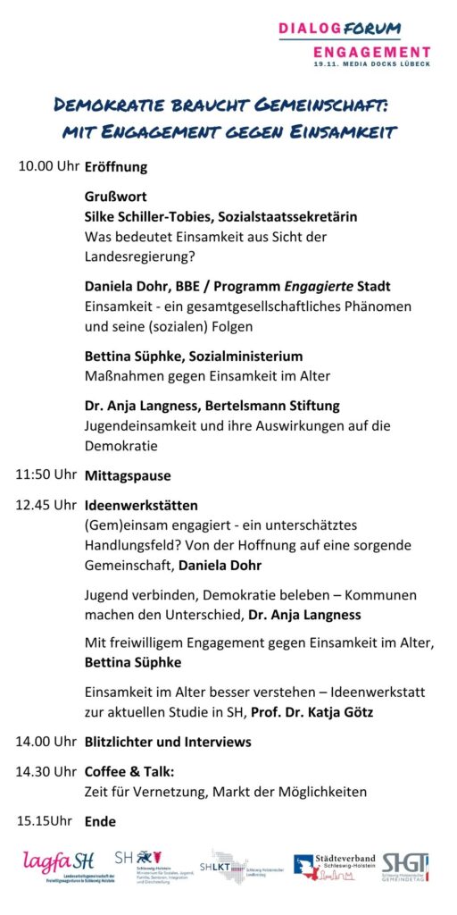 Die lagfa Schleswig-Holstein, die Kommunalen Landesverbände SH sowie das Ministerium für Soziales, Jugend, Familie, Senioren, Integration und Gleichstellung laden herzlich ein zur Engagementkonferenz 2025 unter dem Motto „Demokratie braucht Gemeinschaft: mit Engagement gegen Einsamkeit“.