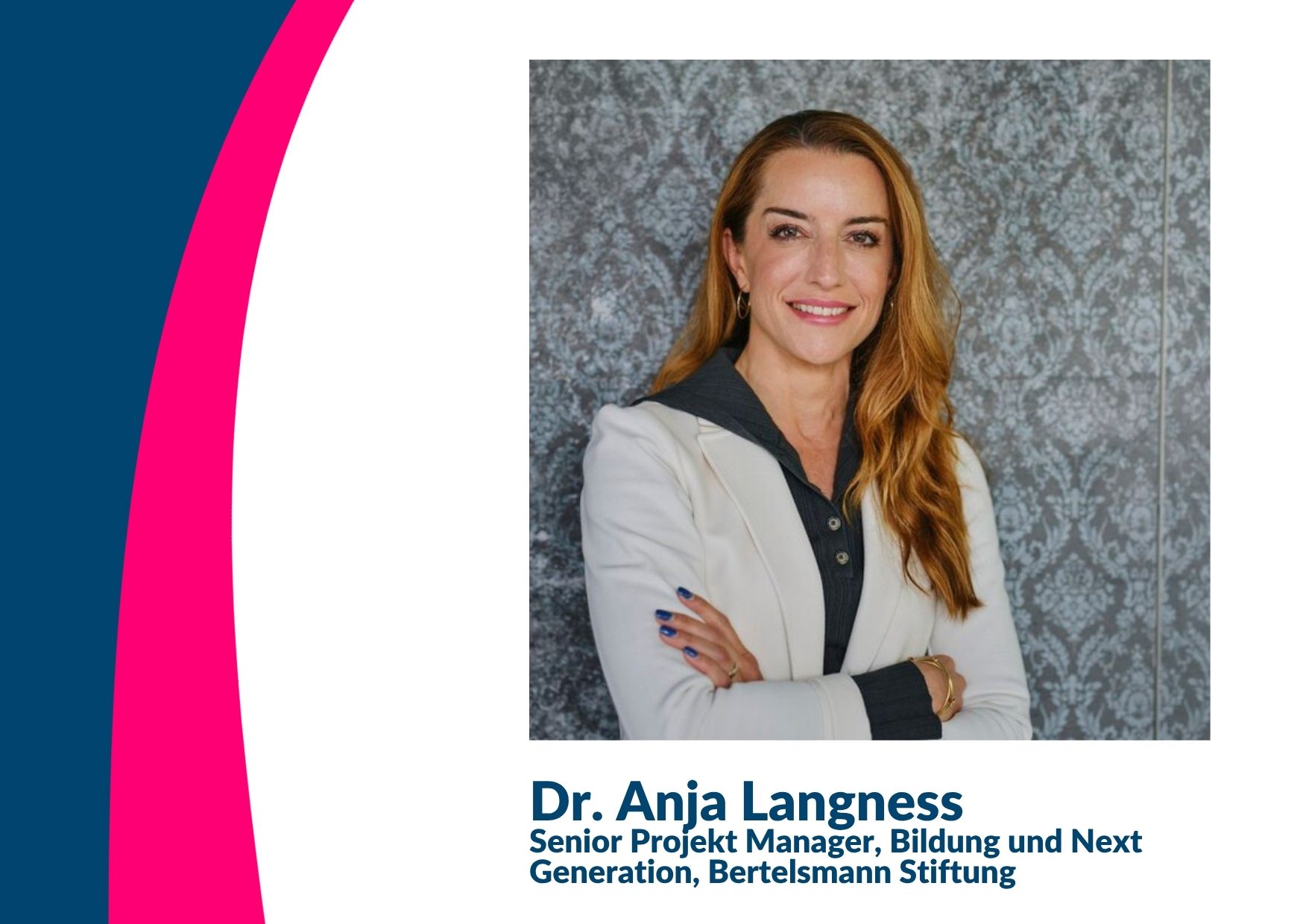Dr. Anja Langness, Senior Project Managerin im Bereich Jugend und Next Generation bei der Bertelsmann Stiftung, ist Erziehungs- und Gesundheitswissenschaftlerin und promovierte in Public Health an der Universität Bielefeld. Ihr Arbeitsschwerpunkt liegt auf Jugendbeteiligung, nachhaltiger Entwicklung und dem Transfer von Forschungserkenntnissen in die Praxis.